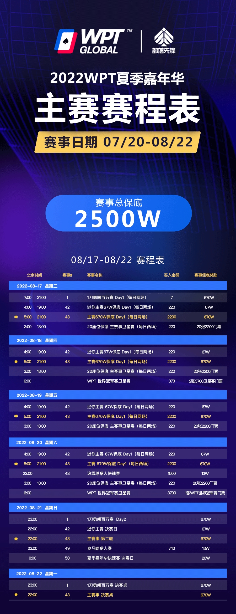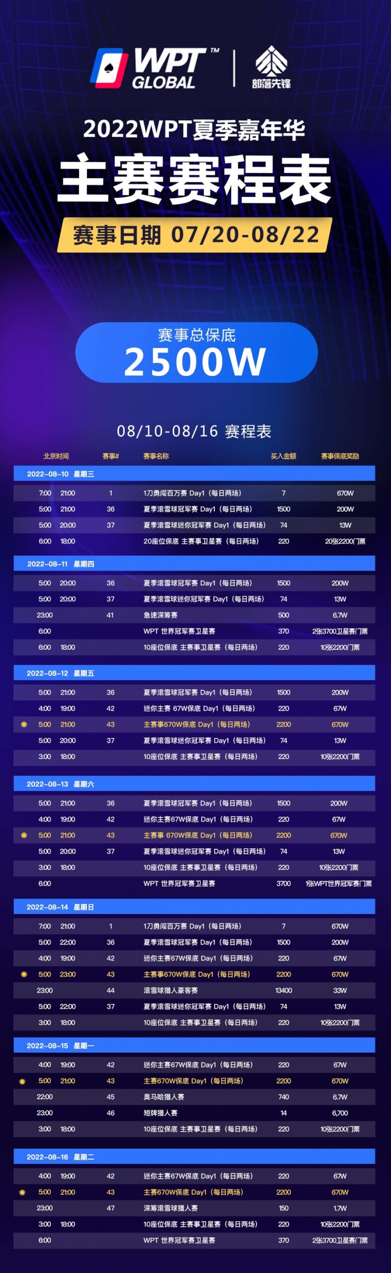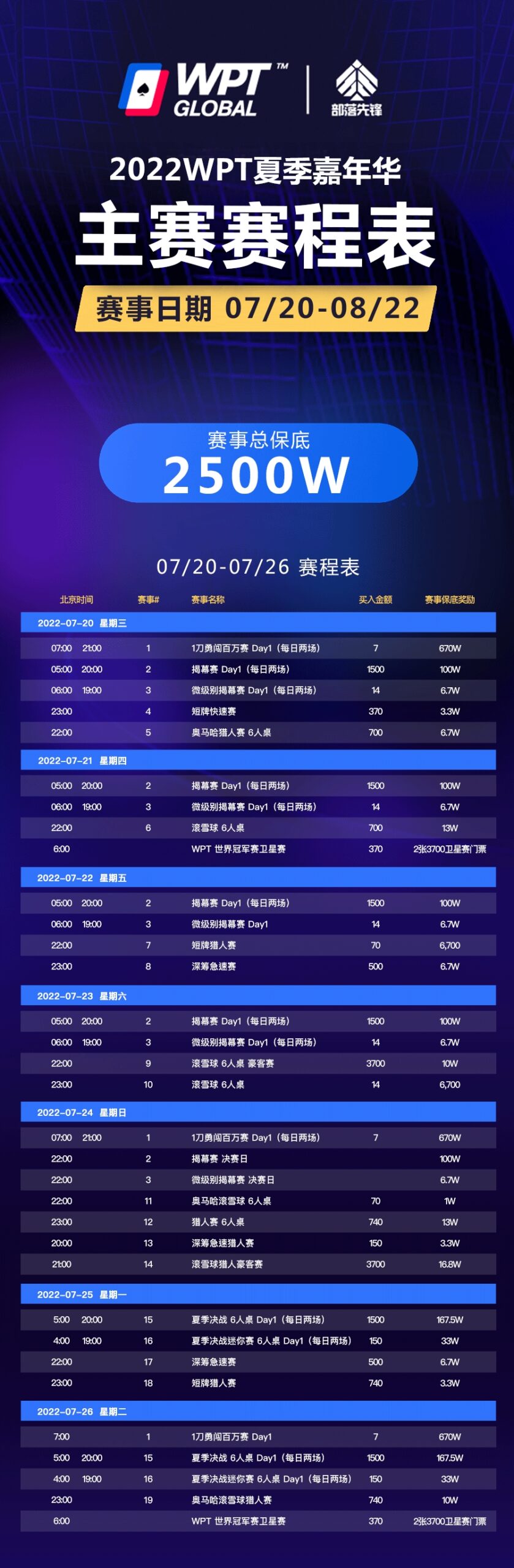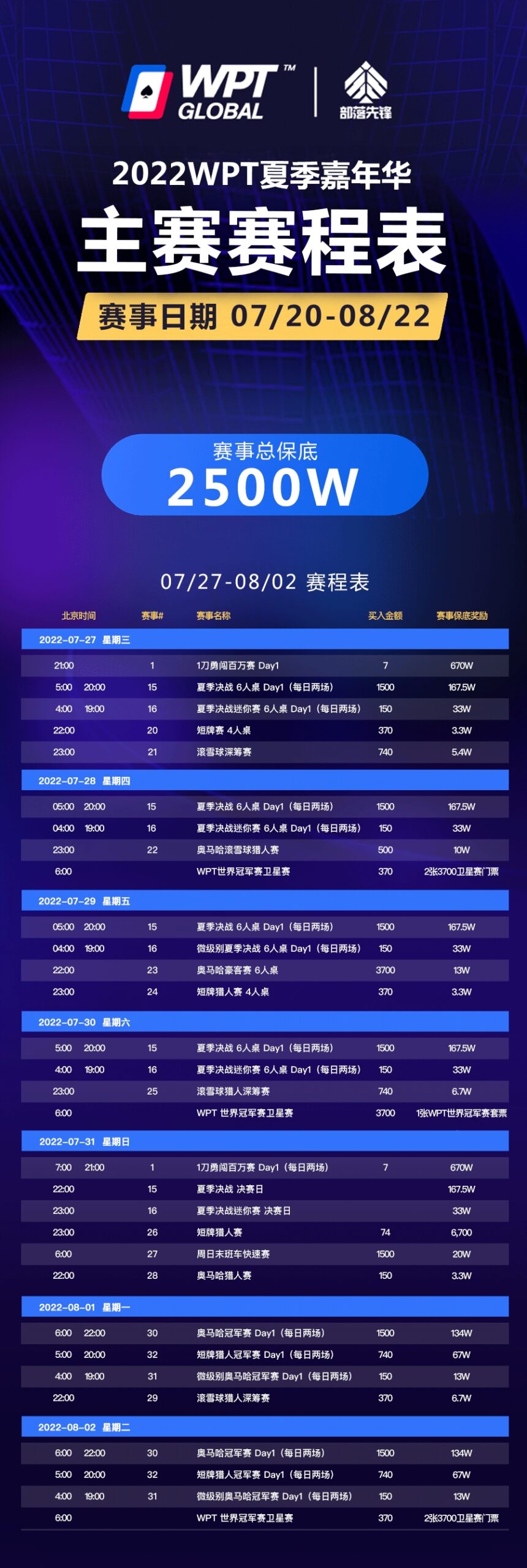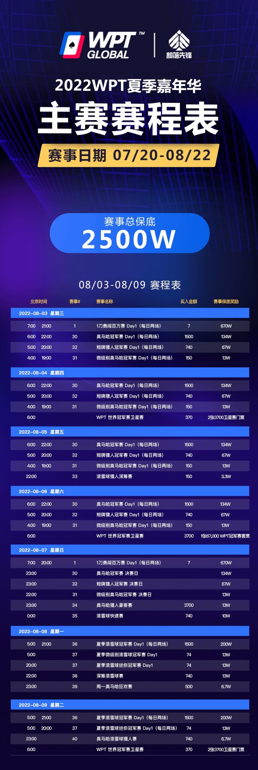 今年的WPT夏季嘉年华可以说诚意满满,超过三十天的赛程让你在七八两个月都能随时随地的选择适合自己的比赛,那么让我们一起看看整个比赛的赛程表。