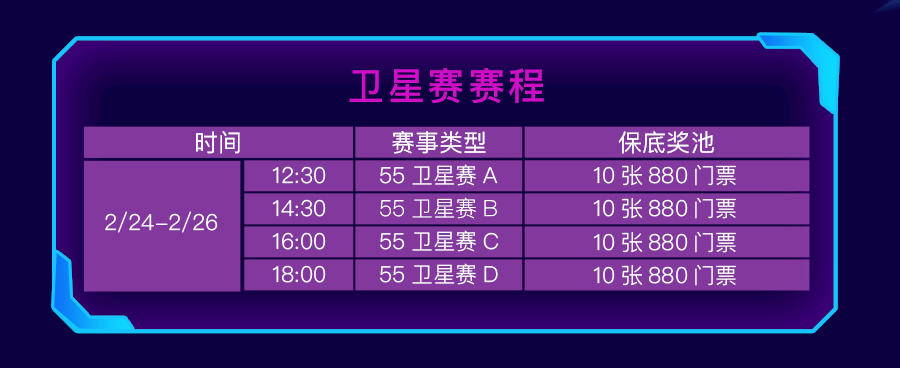 2月24日至2月26日,每日4场55卫星赛,保底10张巅峰月赛主赛门票。