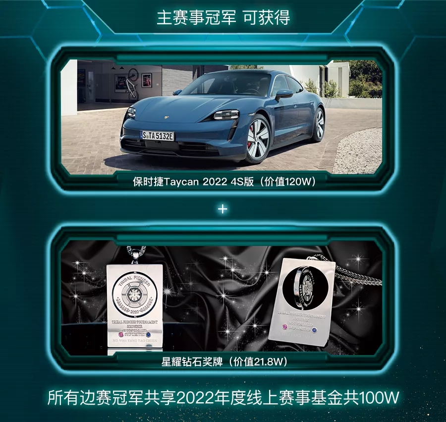 主赛冠军可以获得价值120w的保时捷Taycan跑车一台以及价值21.8w的星耀钻石奖牌一块!