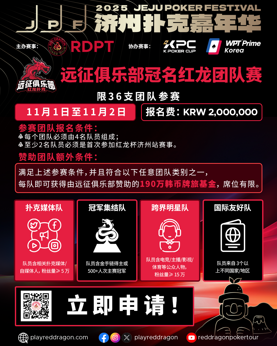 红龙杯团队赛招募开启!与挚友一起远征出战,开启济州扑克嘉年华狂欢盛宴。