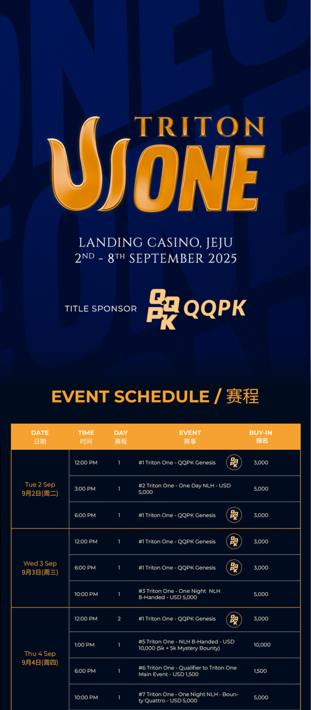 Triton ONE不仅是一场扑克系列赛,更是一段目的地式的沉浸体验:从牌桌上的高强度对决,到济州顶级的款待与服务,每个环节都为玩家与随行嘉宾打造难忘的一周。无论你为牌局、为连接,还是为文化而来,济州神话世界都已准备就绪,欢迎你的到来。
