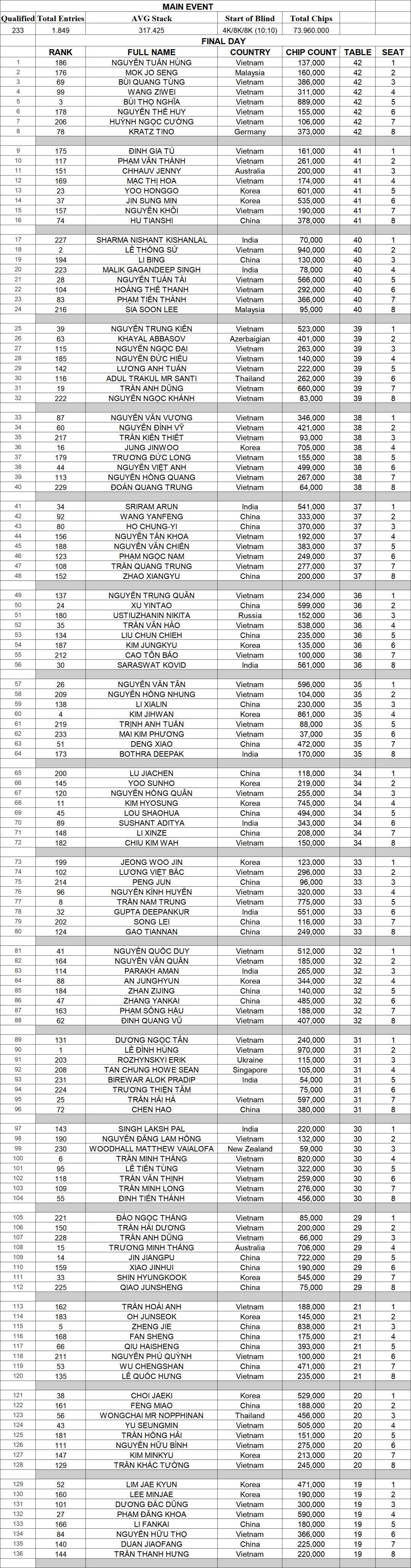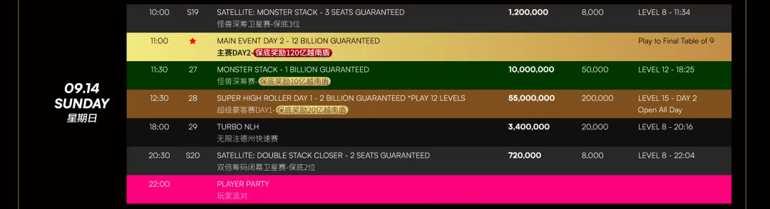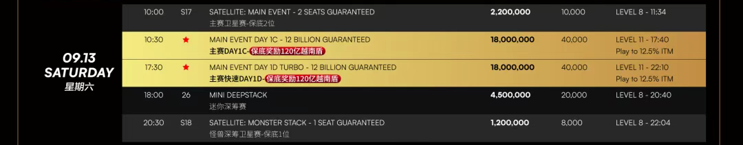 主赛DAY2将于9月14日11:00开始,其中越南选手LÊ ĐÌNH HÙNG以97万记分牌成为DAY1的Chips Leader杀出重围!国人有48人成功晋级DAY2!主赛DAY2会碰撞出什么样的火花呢,咱们拭目以待