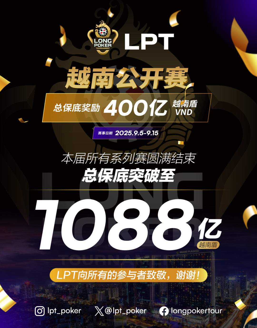 LPT 越南公开赛,历经 11 天的热血角逐,于万众瞩目中圆满落下帷幕!这不仅是 LPT 品牌征程中一次敢为人先的全新尝试,更铸就了一场超出预期的巅峰突破 ,原定 400 亿越南盾的赛事总保底,最终以 1088 亿的惊人战绩震撼收官!这跨越性的飞跃,是每一位参赛者热情与信任的凝聚,是赛场内外同心协力的见证,是你们硬核彰显了 LPT 影响力!