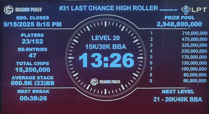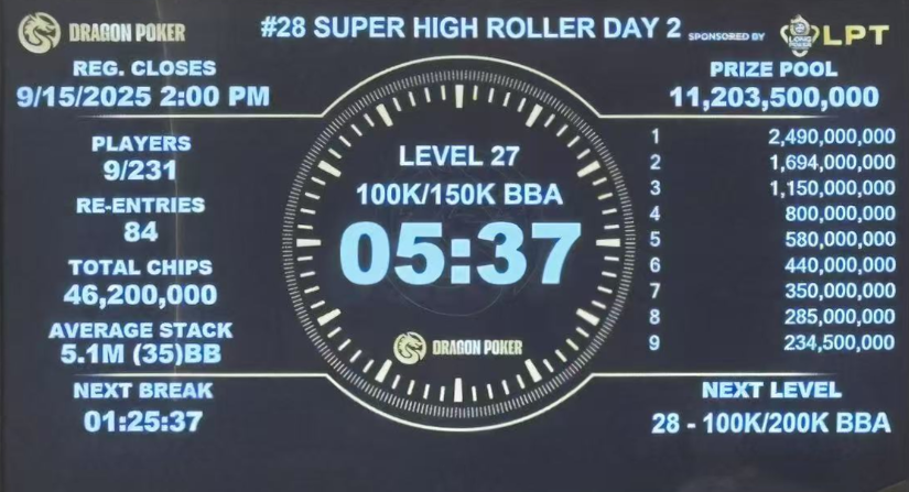 最终LE THONG SU凭借K high收下关键底池6600万,至此双方记分牌比例1:11