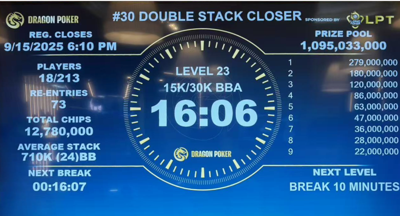 开始时间为9月15日14:00的终极豪客赛,共有73人进入DAY2,但是比赛仍未停止,比赛仍然可以参加,截止志9月15日14:00,共有231人次参与比赛,共35人进入奖励圈