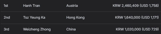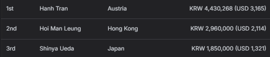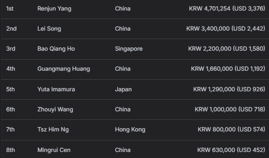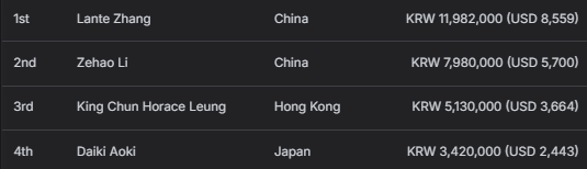 中国香港选手Tsz Yeung Ka获得亚军及1,640,000韩币(约合1,171美元)奖励;中国选手Weizheng Zhong位列季军,收获1,020,000韩币(约合729美元)。