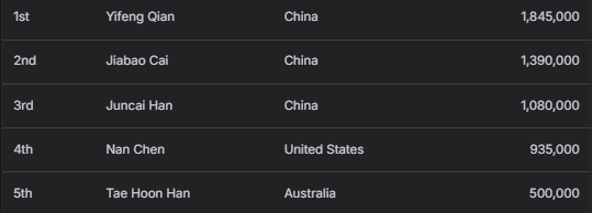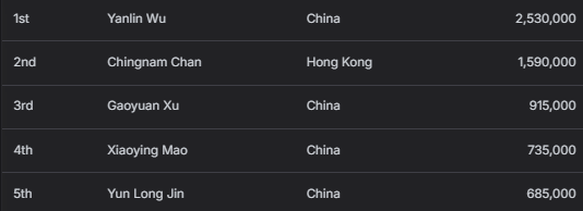 中国选手Difei Wu以14,100,000韩币(约合10,071美元)的季军成绩收官。