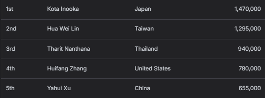同胞Anqi Luo虽奋力冲击冠军,最终以1,810,000韩币(约合1,293美元)的亚军成绩收官;日本选手Mao Yamamura以1,170,000韩币(约合836美元)的季军成绩收官。