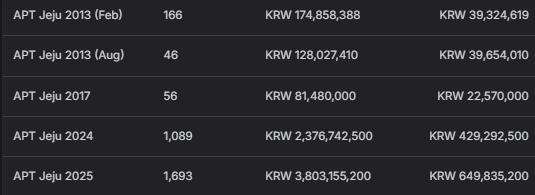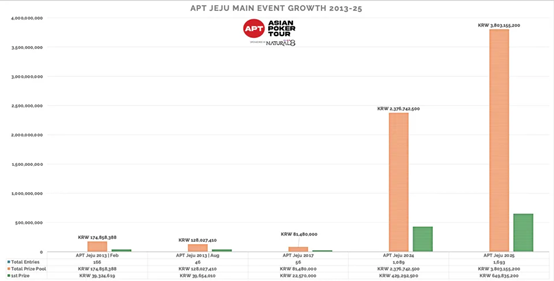 这届比赛是APT在韩国运营的最高奖池赛事,较2013年首届APT济州岛主赛事实现跨越式增长:参赛人次增长超十倍(当年166人次),奖池规模扩大逾二十一倍(当年奖池174,858,388韩币/160,520美元)。