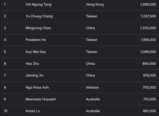 Mingcong Chen状态仍旧火热——这位中国选手刚征服APT超级豪客赛锡狮奖杯,并在小型超级巨星挑战赛中获得亚军,此番以1,203,000记分牌量跻身前三。