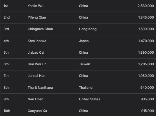 曾在2025 APT台北站主赛事获亚军的Leong,此次以74,500,000韩币(约合53,215美元)的亚军成绩收获生涯第三高奖金。中国选手Lin Zhou则以44,280,000韩币(约合31,630美元)的季军成绩创下个人生涯第三高奖金纪录。