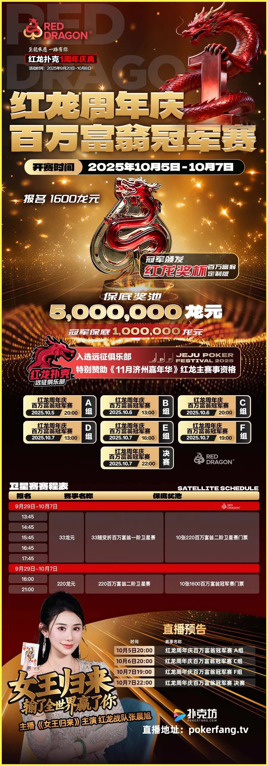10月5日至7日,红龙周年庆百万富翁冠军赛即将打响,保底奖池高达 5,000,000,冠军更是至少获得百万保底奖金。张晨旭将以主播身份,亲自直播见证这一巅峰对决。