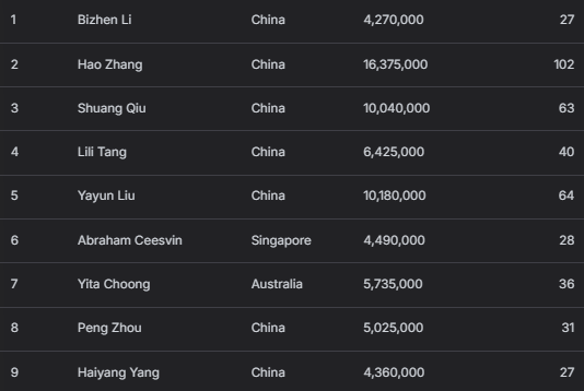 A组第三Yue Sun以572,000记分牌量位列总排名第四;香港选手Ka Chuen Yip作为227人次B组的CL,以572,000记分牌量位列总排名第五。