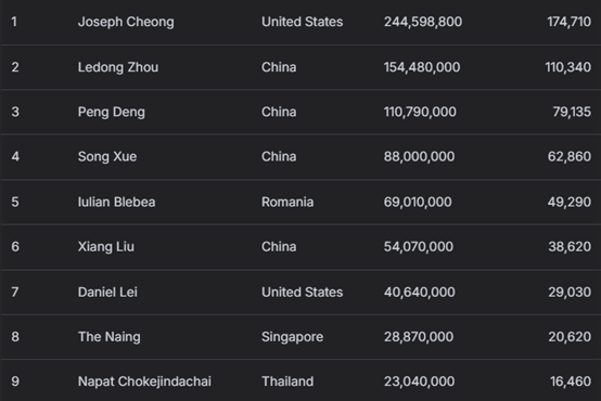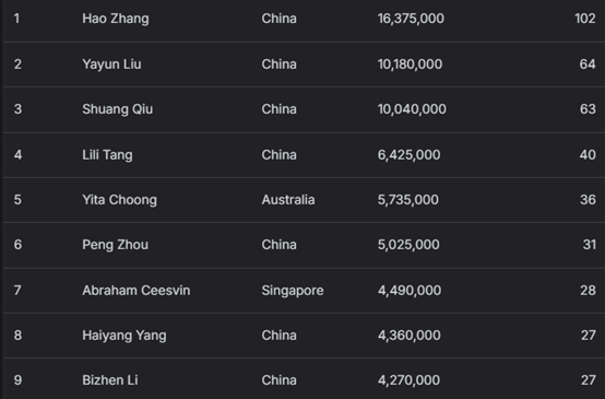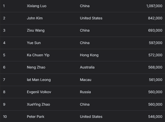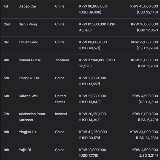 另一位中国选手Sishu Peng同样表现惊艳,将个人首次现场奖励圈转化为亚军成绩,收获61,300,000韩币(约合43,786美元)总奖励(含18,000,000韩币赏金)。中国选手Chuan Feng以68,000,000韩币(约合48,571美元)总奖励(含27,000,000韩币赏金)的季军成绩收官,并突破了10万美元职业生涯奖金里程碑。