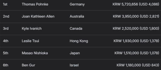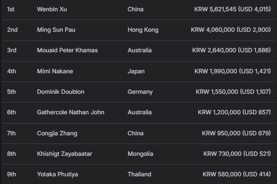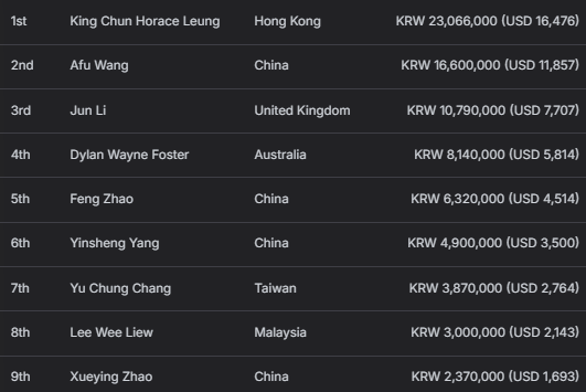 中国选手Afu Wang与冠军奖杯失之交臂,最终获得亚军及16,600,000韩币(约合11,857美元)奖励;英国选手Jun Li以10,790,000韩币(约合7,707美元)的季军收官。