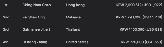 马来西亚选手Fei Shan Ong虽表现强势,但最终屈居亚军,获得1,790,000韩币(约合1,278美元)奖励;泰国选手Gatmanee Jitlert以1,150,000韩币(约合821美元)的季军成绩收官。
