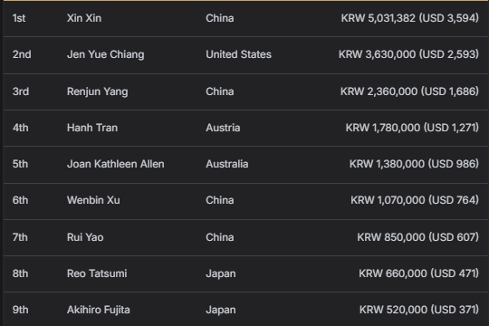 美国选手Jen Yue Chiang获得亚军,收获3,630,000韩币(约合2,593美元)奖励;中国选手Renjun Yang以2,360,000韩币(约合1,686美元)的季军成绩收官。