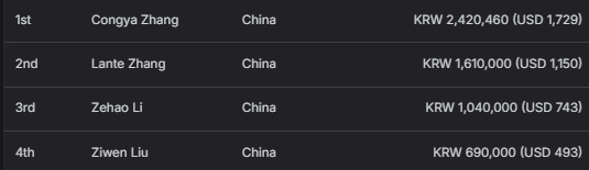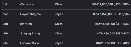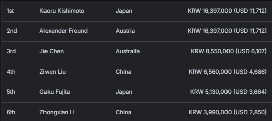 日本选手Hayato Kitajima获得亚军,收获1,840,000韩币(约合1,314美元)奖励;中国选手Bin Yuan以1,170,000韩币(约合836美元)的季军成绩收官。