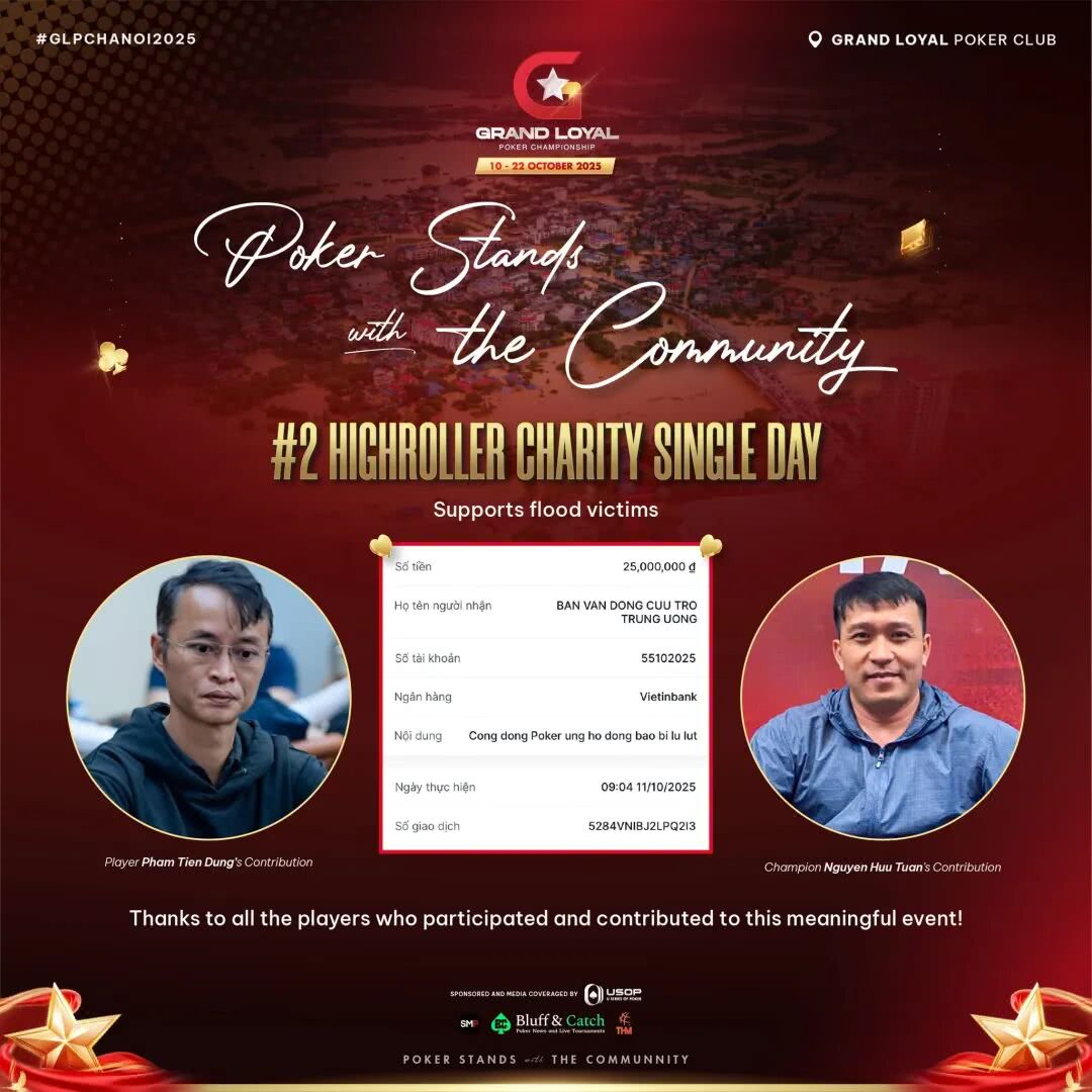在当日赛事结束后,Pham Tién D ǔng 先生慷慨捐赠1500万越南盾,慈善赛冠军NGUYEN HUU TUAN 先生额外捐赠1000万越南盾,以支持遭受暴雨和洪水严重影响的受灾人民。